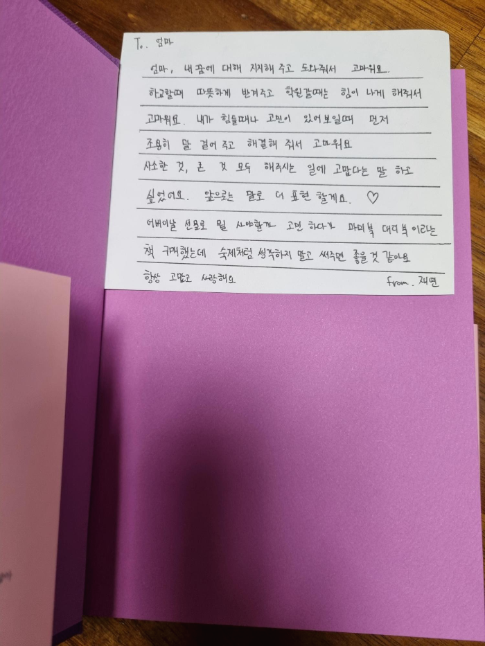 사춘기를 지난 건지 진행 중인지 감이 사라졌지만 살짝 예민한 면이 있는 첫째이기에 조심스러운 요즘인데 이렇게 정성스럽게 쓴(특히 내 카드) 손 편지를 건네다니 첫 줄 읽는데 눈물이 핑 돌았다.(나 주책인가?ㅠㅠ)
