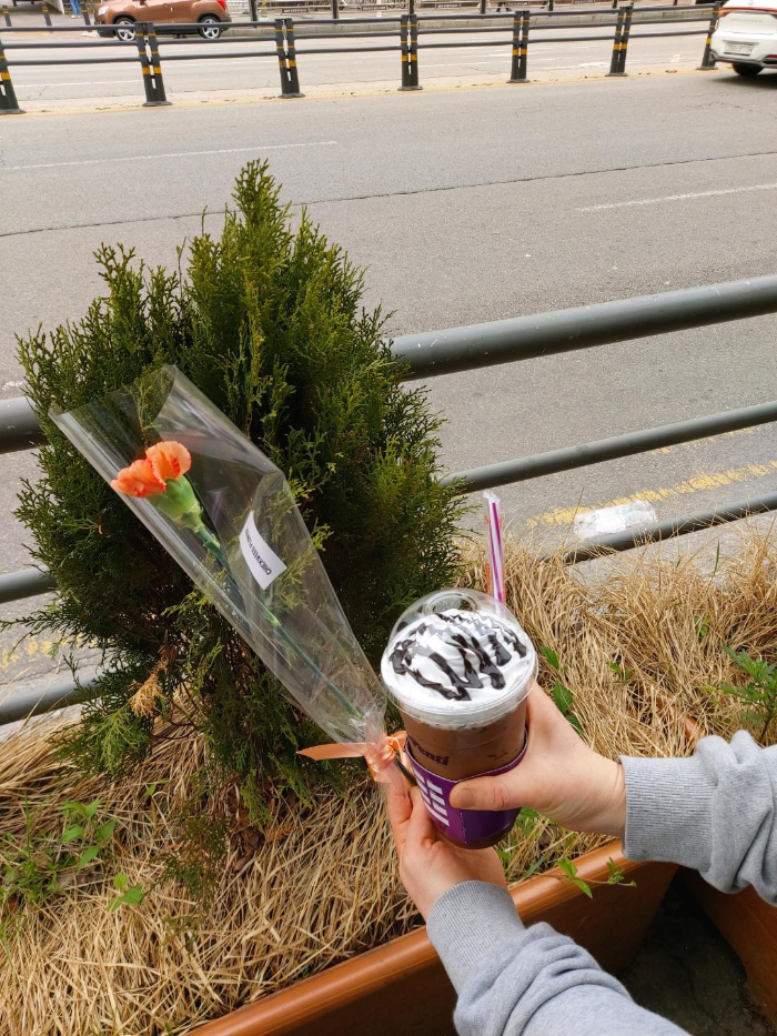 휘핑크림 잔뜩 올라간 시원한 카페모카 한잔과 좋아하는 주황빛 카네이션 한송이를 선물로 받고 집으로 귀가했다. 사진 찍는 것도 찍히는 것도 싫어하는 신랑이 기념으로 찍어주니 후딱 길거리 인증샷도 남겼다. 고마워 아들아♡
