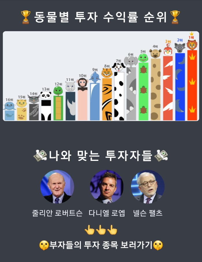 동물별 투자 수익률 순위도 나오네요. 저는 딱 중간 정도 되네요 ㅋㅋ 1위 사자 나오신 분 있으시나요~~?