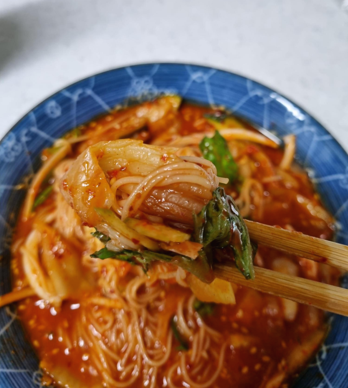 내일은 더 덥다니 시원한 묵은지 넣은 국물 있는 비빔국수 어떠세요^^