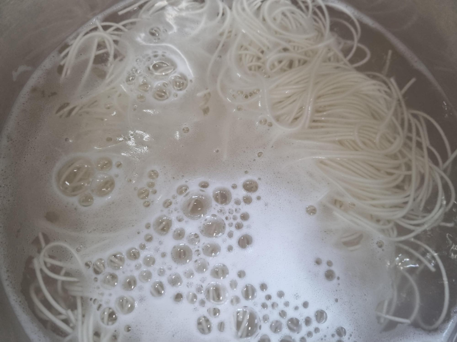 이제 면을 삶습니다. 물이 끓으면 1인분 소면을 넣고 부글부글 끓으면 찬물 1컵을 넣고 다시 끓어오르면 찬물 1컵 넣고 이 과정을 3번 정도 하고 바로 불 끄고 찬물에 박박 씻어 물기를 빼줍니다.