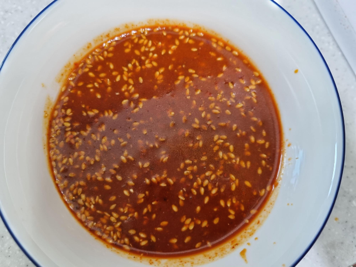 고추장 2큰술, 고춧가루 2큰술, 식초 1큰술, 설탕 1큰술, 매실청 1큰술, 양조간장 1큰술, 참기름 1큰술, 다진 마늘 1큰술, 간 통깨 1큰술 을 한데 섞어 놓습니다. 그냥 비비면 국물 없는 비빔국수가 되겠네요. 오늘은 국물이 포인트입니다 ㅋㅋ
