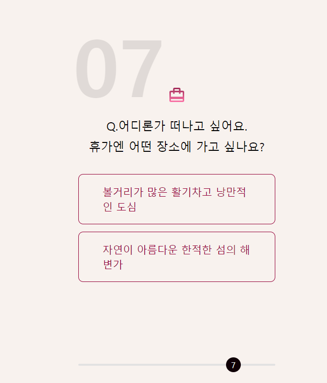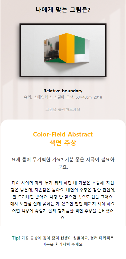 그림 성향 파악을 위해 8가지 질문에 답하고 나면 내 성향에 맞는 그림을 추천해주는 심리테스트입니다.