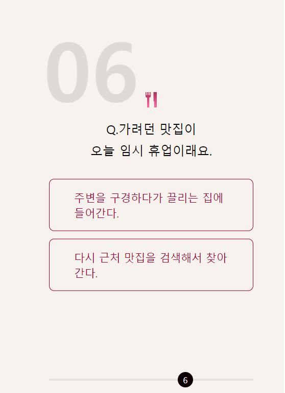 총 8개의 문항에 대해 답하면 테스트 결과에 따라 총 5가지의 서로 다른 그림을 추천받을 수 있다고 하네요. 궁금하신 분은 아래 링크를 참고해주세요.