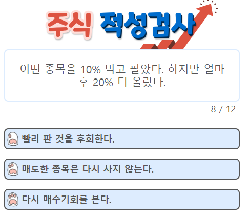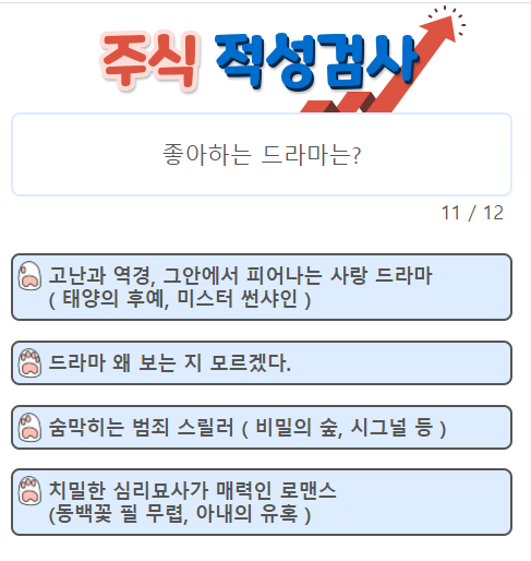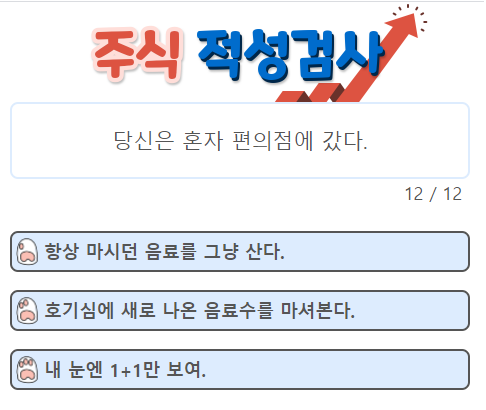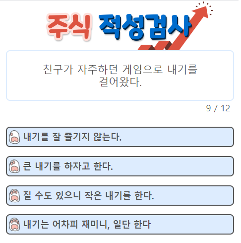 핫한 주식이다 보니 재미로 알아보는 주식 적성 검사가 있길래 후딱 데려왔어요. 일명 주식 성향 테스트입니다. 과연 전 어떤 성향인지 한 번 살펴보고 가겠습니다.