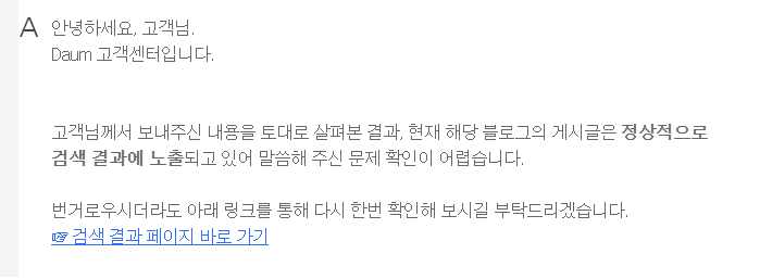 다음 답변 메일은 이틀 뒤인 어제 왔지만 내용은 '정상적으로 검색 결과에 노출되고 있어 말씀해 주신 문제 확인이 어렵습니다' 이렇게 왔네요 ㅎㅎ