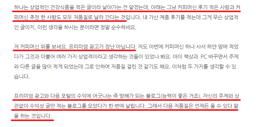 위의 글을 보면 그냥 커피머신 후기 적은 사람과 커피머신 추천 한 사람 모두 저품질이 될 수 있다는 것입니다. 그 이유는 바로 커피머신이란 키워드에는 프리미엄 광고가 엄청 붙는다고 합니다.