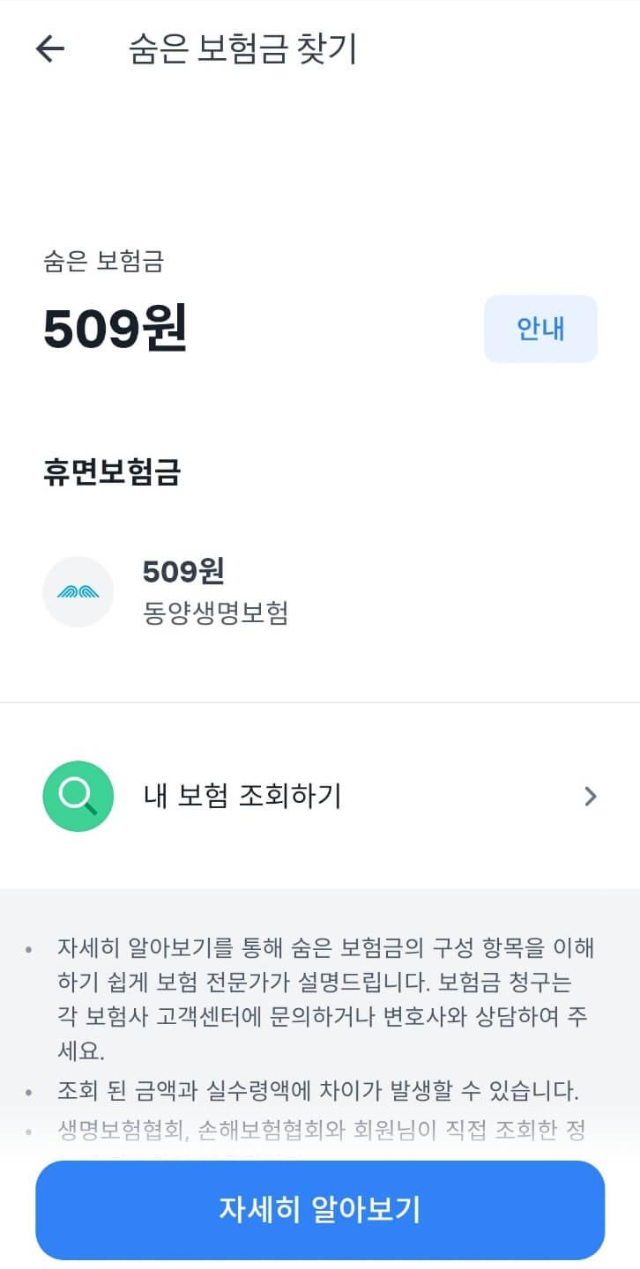 비상금 숨겨놓은 것처럼 짠 하고 나타나면 참 좋을 텐데요. 전 3월에 보험금 찾기를 한 번 해서 하나도 안 나올 줄 알았는데 이렇게 또 숨은 보험금 509원이 나오네요^^