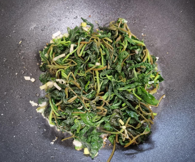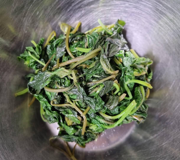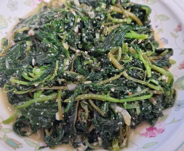 이미 데친 깻잎순이고 깻잎은 생으로도 먹는 식재료이기에 들깨가루 듬뿍 1큰술 넣고 살짝 볶은 다음 마무리 지었네요.
