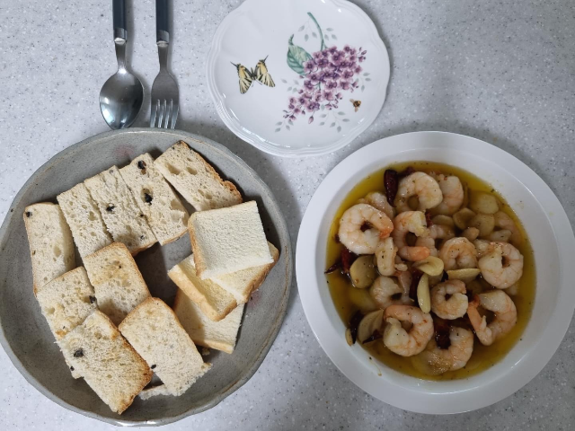 냉동실에 있던 치아바타와 식빵을 에어프라이어에 구워서 같이 차렸어요. 제가 새우 2개 정도 먹고 나머지는 첫째가 다 먹었답니다.
