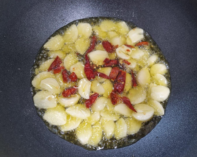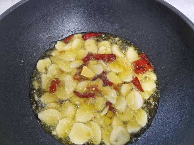 웍에 올리브오일 넉넉히 넣고 편마늘 하나 넣어보고 끓어오르면 편마늘을 넣고 튀기듯 익혀줍니다. 그리고 베트남고추도 넣어줘요.