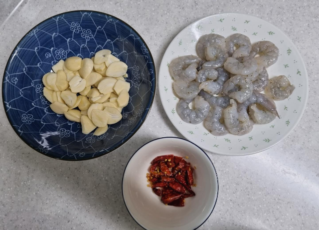 새우 20마리, 마늘 20개, 페퍼론치노 대신 베트남고추 7~8개, 올리브오일, 후추, 파슬리가루