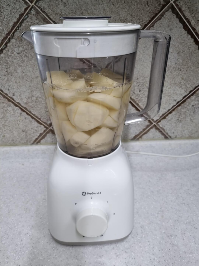 씻어서 껍질 벗긴 감자를 작은 조각으로 썰어요. 믹서기에 넣고 믹서기에 잘 갈아지도록 물도 500ml 정도 넣어줬네요.