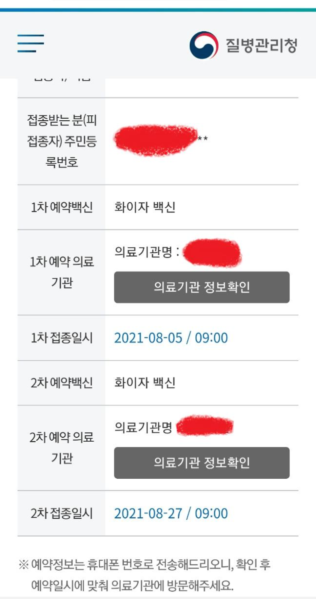 5분도 채 안되어서 코로나 예방접종 사전예약이 완료되었습니다. 예약정보를 확인하니 화이자 백신 2차 접종일시도 나와있습니다. 화이자 백신 1차와 2차 접종 간격은 3주 정도 됩니다. 교육 및 보육 종사자 코로나 예방접종 화이자 백신 1차 접종일시가 8월 7일까지이기 때문에 9월 전에 2차 접종까지 모두 끝마칠 수 있습니다.