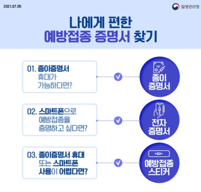 집에 와서 침대에 누워있으면서 질병관리청에서 안내해 준 코로나19 예방접종 증명 방법을 찾아보니 종이증명서, 전자증명서, 예방접종 스티커를 이용한 방법 총 3가지가 있더라구요.