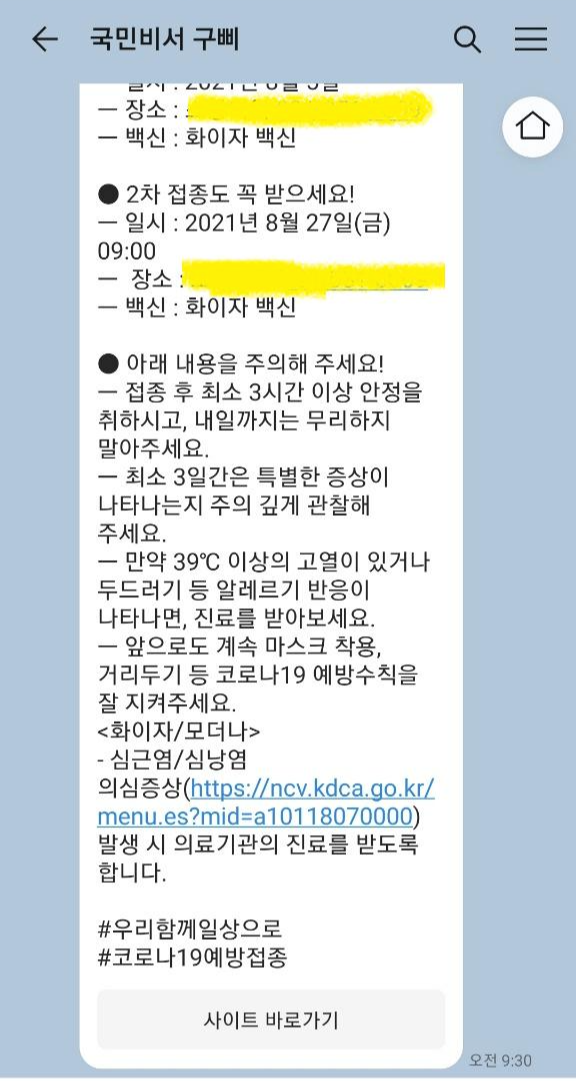 안내문 받고 잠시 10여분 있다가 가라고 해서 잠시 병원 내 머물러있었습니다. 10여분 지나니 국민비서 구삐에서 2차 접종 안내 톡이 오더라구요. 2차는 3주 뒤인 8월 27일(금요일) 9시입니다.