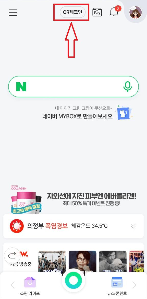 네이버 앱에 들어가 상단 QR체크인에 들어갑니다.