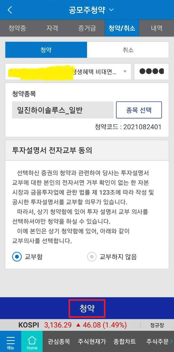 확인을 누르고 청약하러 가볼게요. 일진하이솔루스_일반 청약종목정보 확인 후 하단 청약 눌러주세요. 투자설명서 전자교부 동의에 교부 의사를 선택 후 청약 누릅니다. 수수료 이야기가 계속 나와요. 증권사들 수수료 덕분에 부자 되겠습니다. 수수료 너무 비쌉니다!!