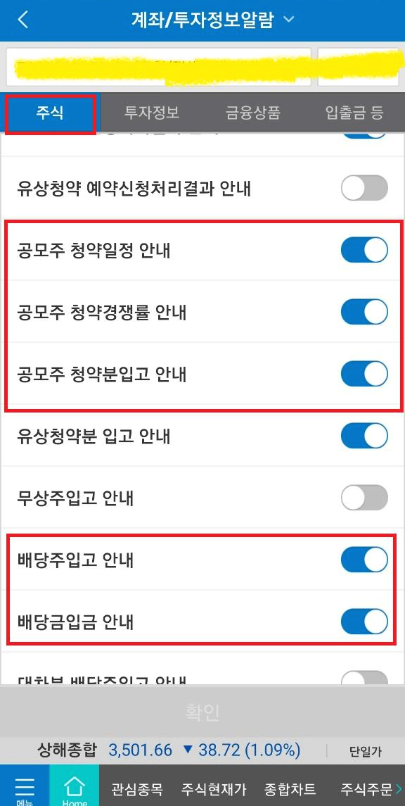계좌/투자정보 알람에 들어가면 공모주 청약 관련 알람, 배당주 관련 알람 등 다양한 알람 설정이 있으니 필요한 정보 알람 설정해 놓으시길 바랍니다.