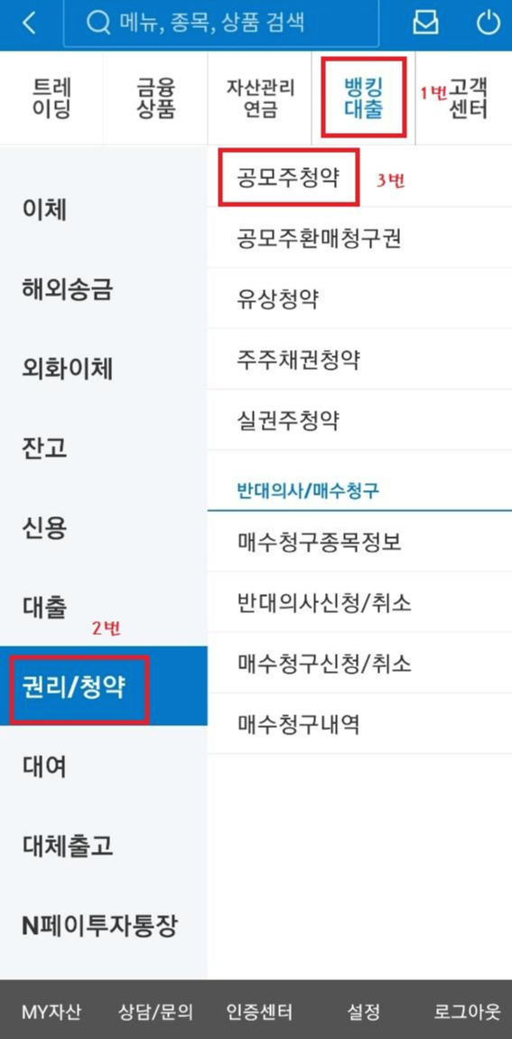 * 위치 : 메뉴 - 뱅킹대출 - 권리/청약 - 공모주청약