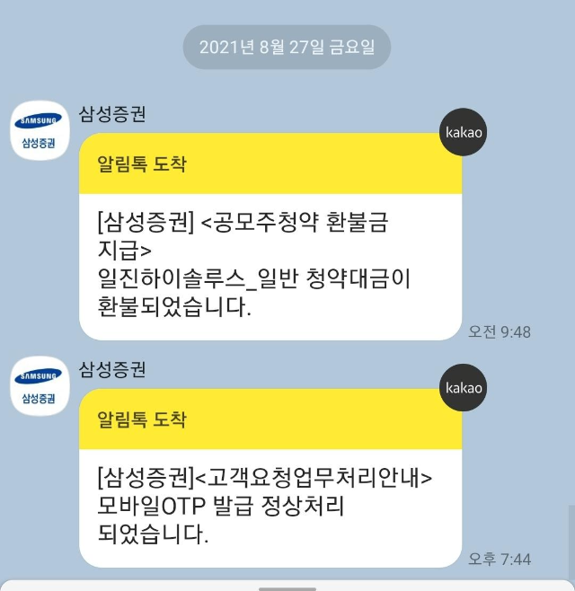오늘(27일) 일진하이솔루스 공모주 청약 환불금이 지급되었다는 삼성증권 카카오톡 알림 톡을 받았습니다.