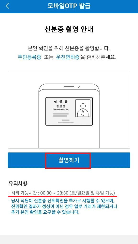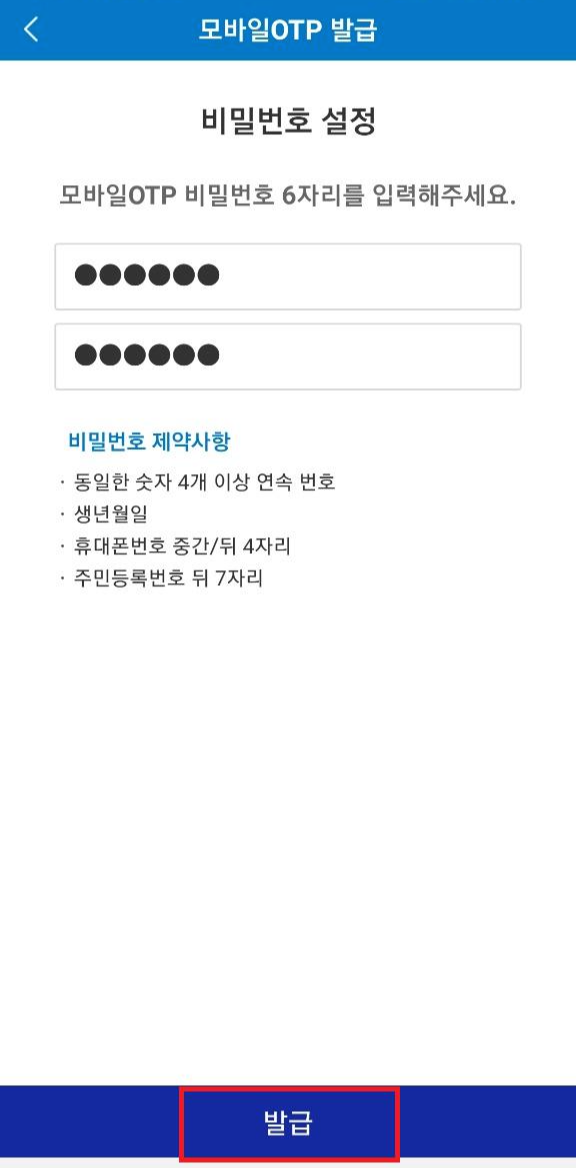 실물 OTP 없이도 간편하게 모바일 OTP를 발급받아 인증할 수 있으니 편리하네요. 모바일 OTP 발급 누른 다음 신분증 활영 후 추가 본인 인증(보안상 캡처 불가)을 한 뒤 비밀번호 6자리를 설정해주세요. 고생하셨습니다. 발급을 누르면 다 끝난 거랍니다.