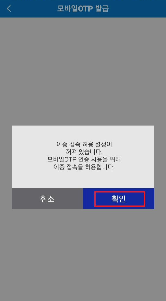 OTP인증/등록/관리 메뉴에서 모바일 OTP 발급으로 들어갑니다. 앗 그런데 이중 접속 허용 설정이 꺼져있다는 메시지가 뜨네요. 바로 확인 눌러 계속 진행하면 됩니다.