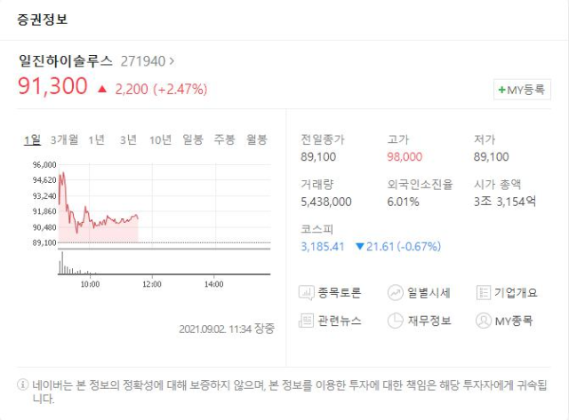 지금 시각 11시 35분 일진하이솔루스 주가를 확인하니 훅 내려갔네요 이론이론. 물론 어제 따상 가격 89,100원보다 무려 2.47% 오른 가격인데 왜 힘이 빠지죠? ㅋㅋㅋ 아침에 팔았어야 하나요 오늘은 코스피 지수도 하락이던데 오후엔 반등 있으려나요~