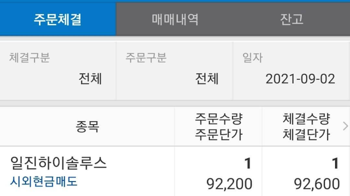 그래서 전 16:00 ~ 18:00 시간외 단일가 매매로 일진하이솔루스 남은 1주를 매도하려고 처음 시도했습니다.