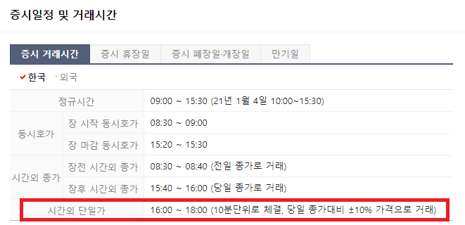 16:00 ~ 18:00 2시간 동안 거래할 수 있는 시간외 단일가 거래는 당일 종가 기준 ±10% 이내에서 10분 단위로 가격이 유동적으로 변합니다.