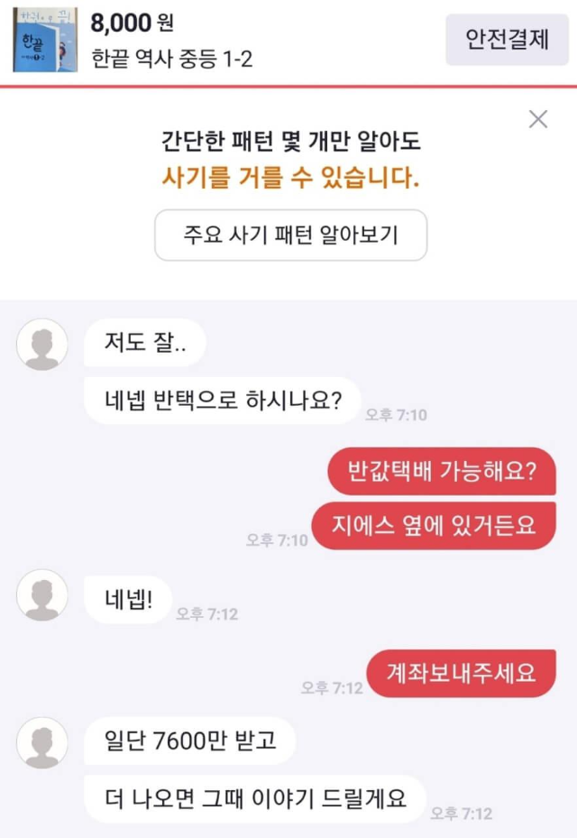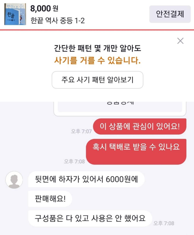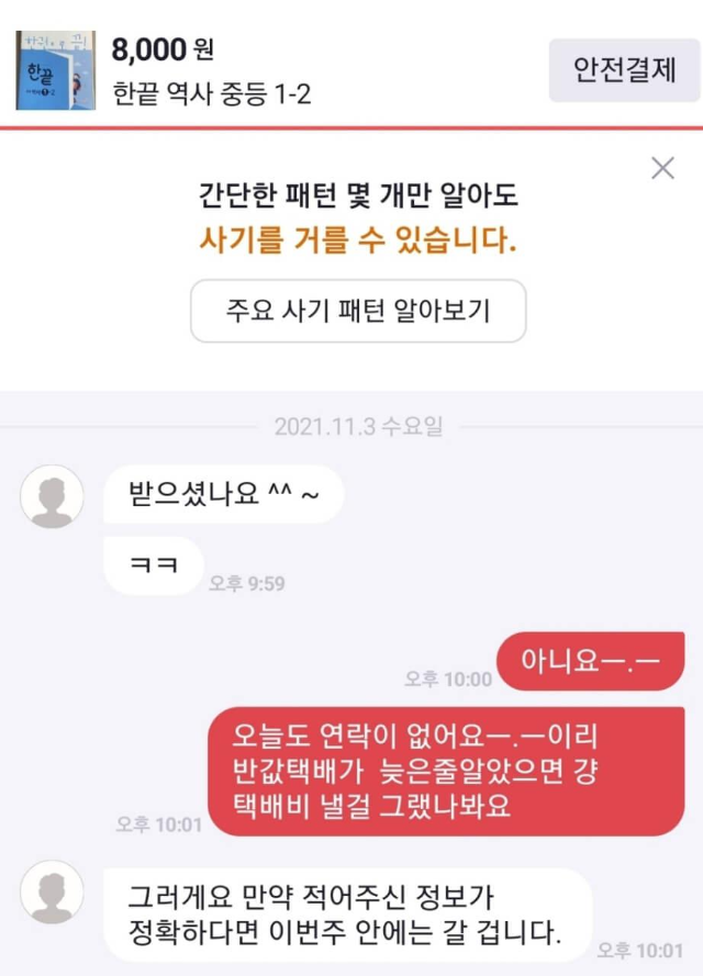 마침 2~3개 보이는데 한 군데 픽해서 번개톡을 나눴다. 8천 원에 올라왔지만 뒷장이 찢겨서 6000원에 주신다고 한다. 따님이 문제집을 잘못 사서 파신다는 판매자분. 번개장터에서 이용하는 번개페이가 있던데 대신 직접 송금했고 판매자분이 반값택배 이용하냐고 해서 한 번도 이용해 본적은 없지만 들어는 봐서 반값택배 이용해서 받겠다고 했다. 단지 내 CU도 있고 후문 바로 나가면 GS편의점이 있으니까 택배비 아낄 겸 이용하기로.