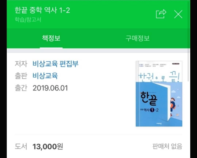 물론 한끝 중학 역사 1-2가 판매 안 하는 건 아니다. 하지만 판매하는 건 2015년 개정 교육과정뿐이다. 아이의 학교는 왜 2009년 개정 교육과정을 배우는지 이것도 참 의문스럽다. 암튼 아들이 현재 배우고 시험 범위 내용이 바로 이 문제집에 담겨있다 해서 사려는데 판매처가 없다. 아니 절판이다 ㅠㅠ 절판인데 어떻게 구하는가 아이고
