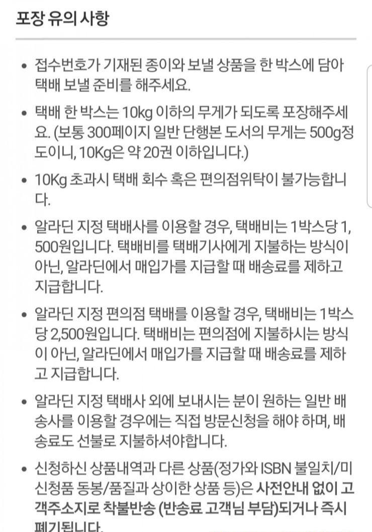 알라딘 지정택배사를 이용하면 택배비가 1박스당 1,500원이고 알라딘 지정편의점은 1박스당 2,500원이다.
