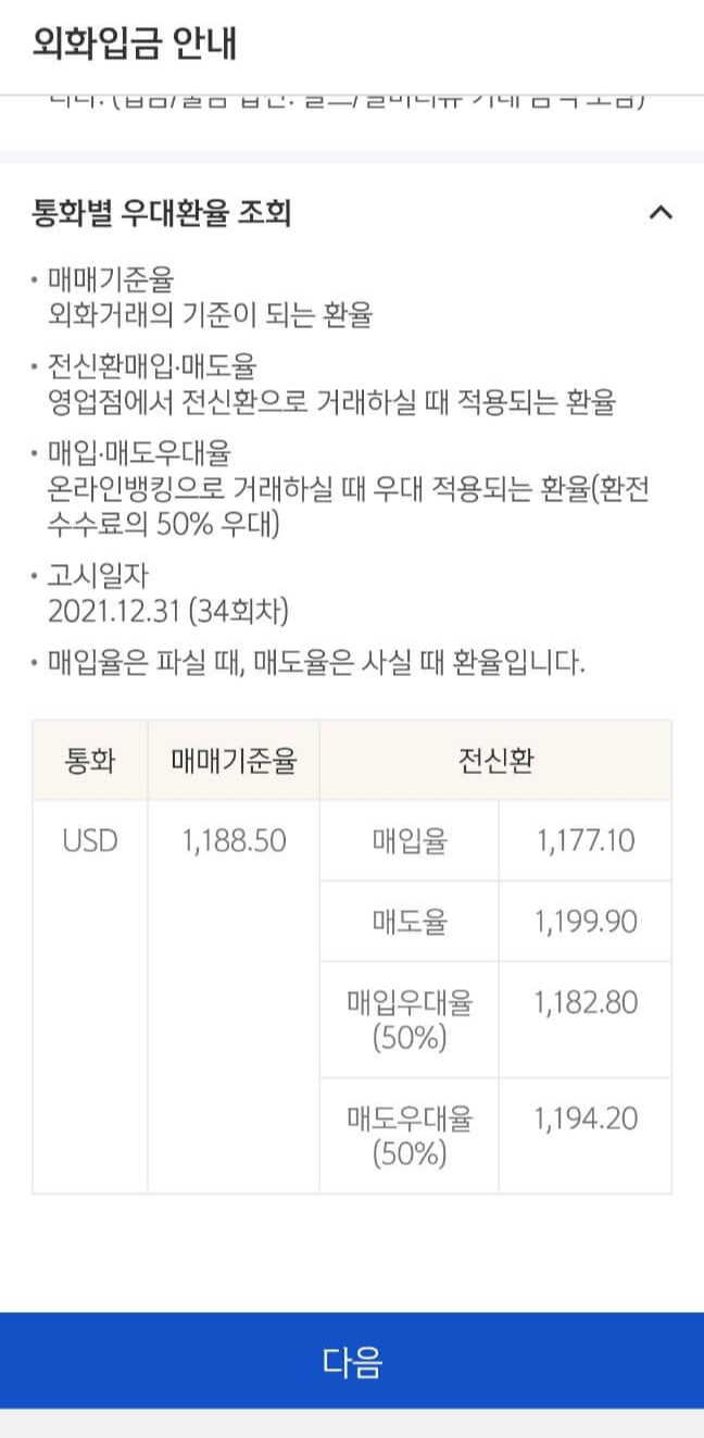 외화 체인지업 예금의 입금을 누른다. 매매기준율은 1188.50이지만 난 달러를 사야 되는 입장이니 매도율을 봐야겠지? 환전 수수료 50% 혜택이 있음에도 불구하고 1194.20원이다. 환율이 무지 높을 때구나. 구글 애드센스 수익 받으면 투자에 다 쓰지 말고 약간은 예수금으로 남겨놔야겠다.