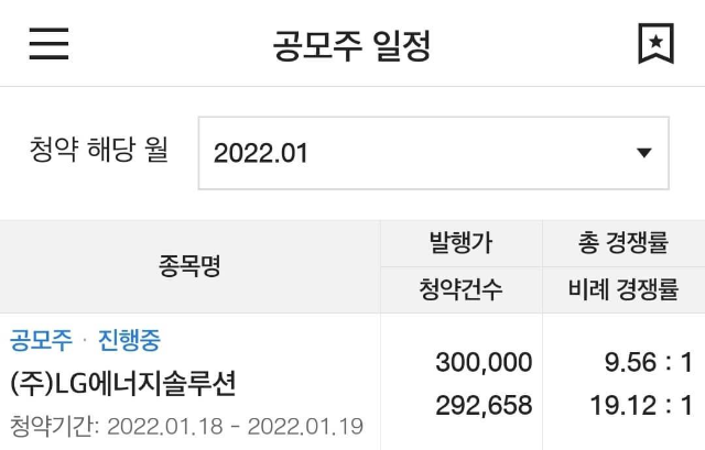 | LG에너지솔루션 공모주 최종 청약경쟁률 ( feat. 1월 19일 4시 마감 경쟁률) (9) | 2022.01.19 |