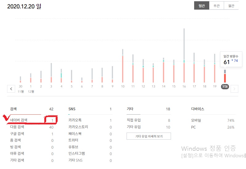 그런데 오늘 아침 티스토리 검색 유입을 살펴보니 웬걸 네이버 검색 1이란 숫자가 보인다.