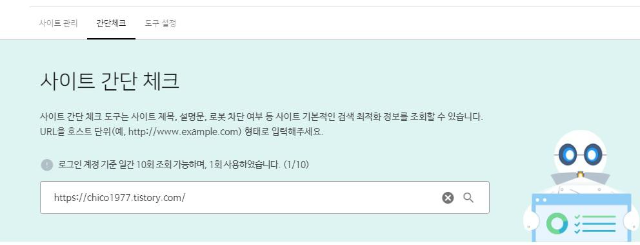 상단 메뉴 간단 체크 클릭해서 티스토리 주소를 적고 오른쪽 돋보기를 클릭하며 다음과 같은 팝업이 뜬다.
