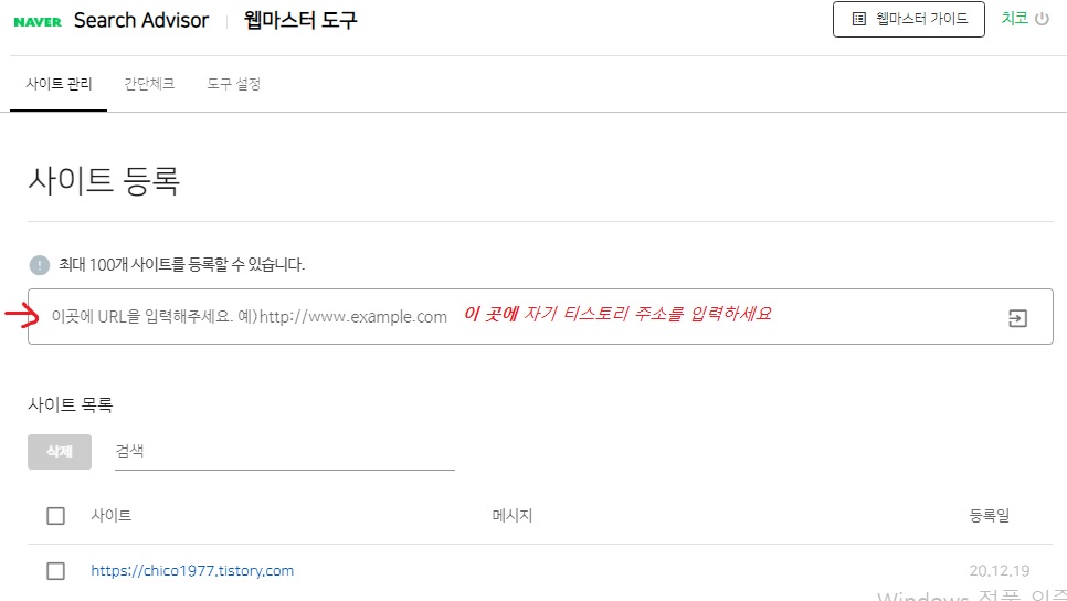 웹마스터 도구 - 사이트 관리 들어가서 검색 노출하고픈 자신의 티스토리 주소를 등록한다. 입력하고 우측 화살표 표시 클릭.