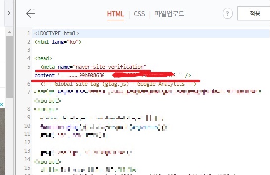 사이트 등록하고 사이트 소유확인을 누른 뒤 메타태그를 복사해서 티스토리 스킨편집 들어가 <head>와 </head>사이에 코드를 추가하고 우측 상단 적용을 누른다.