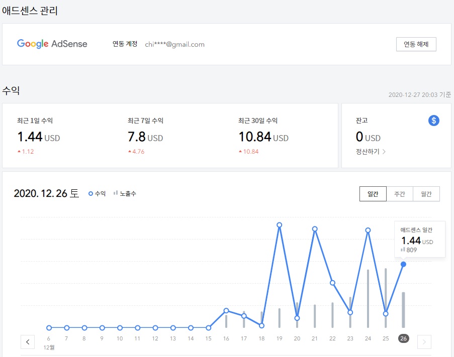 혹시나 해서 애드센스 수익을 확인해본다.