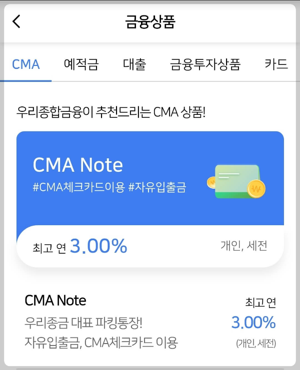 토스뱅크 2% 이자에 많은 사람들이 파킹통장으로 토스뱅크를 이용 중일 텐데 이젠 2% 이상 주는 입출금통장들이 늘어나고 있다. 토스뱅크가 편하지만 나는 파킹통장으로 우리종합금융 3% 자유입출금 CMA Note계좌를 이용중이다.
