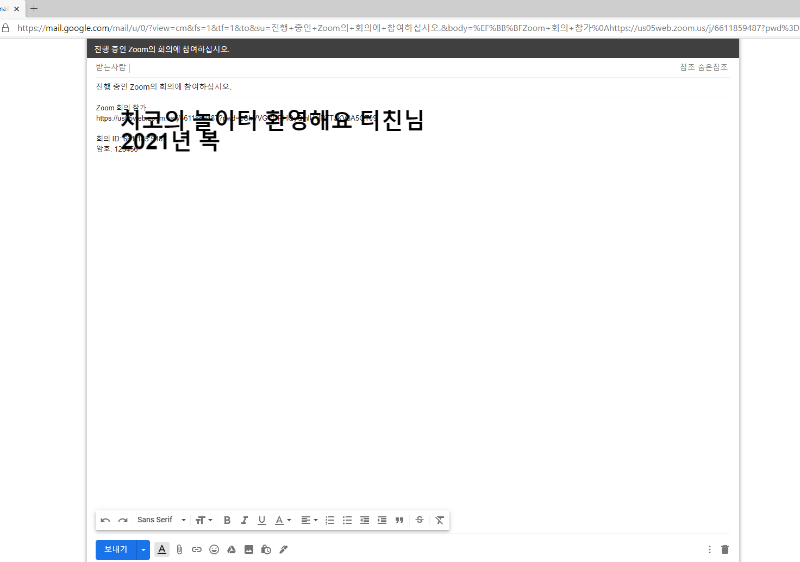 폰이 아니라 메일이 더 편핸서 이메일로 보내는 방법을 확인해 본다. 익숙한 가운데 Gmail 클릭해본다. 아래와 같이 Zoom회의 참가 링크 주소와 회의 ID와 암호가 복사가 되어 받는 사람만 적어 보내면 된다.